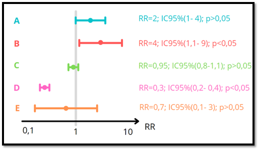 Figura 1, de caráter exclusivamente didático e sem respeitar escalas, apresenta os resultados (riscos relativos e respectivos IC 95%) de cinco ensaios clínicos hipotéticos (A, B, C, D e E) comparando o efeito da ‘covidina’ versus placebo no risco de hospitalização entre pacientes com Covid-19.   O Quadro 1 apresenta a interpretação adequada dos resultados de cada estudo.