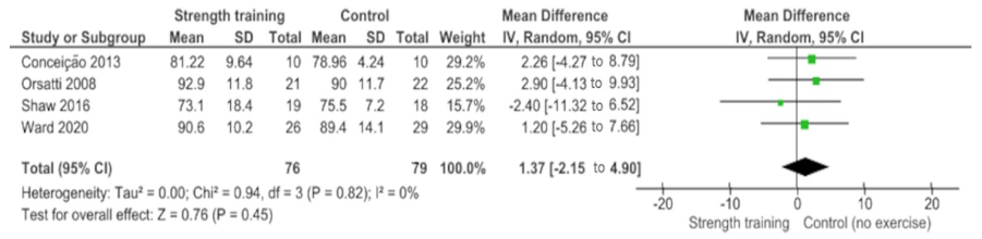 - 2ª. coluna: valor médio encontrado em cada estudo, seu respectivo desvio padrão (representado por “SD”, do inglês, standard deviation) e o número total de indivíduos avaliados no grupo intervenção.